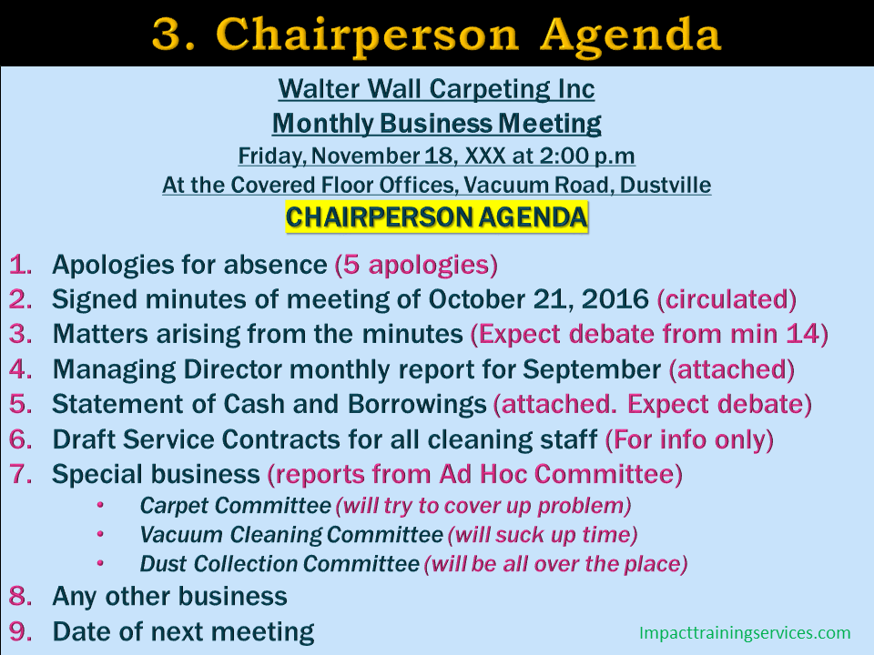 If you have to chair meetings, this type of agenda is extremely important, especially for meetings which are likely to be heated or acrimonious.