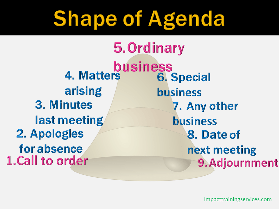 If you look at it carefully, you will notice that the items on an agenda are arranged in the shape of a bell. They start with some simple items, moving to the important items round about the top and them falling to some not so important items again towards the end.