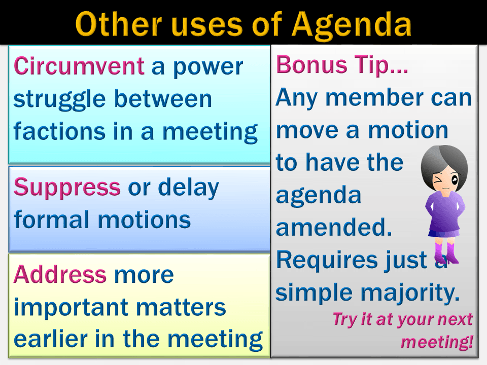 You can “push through” unpopular motions or schedule them for discussion when time is short or key opponents are absent.